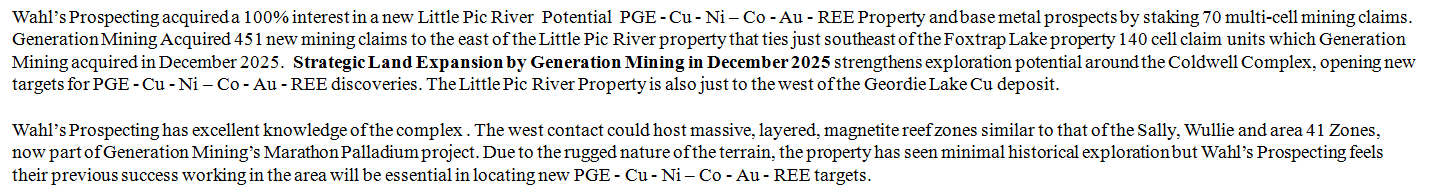 Generation Mining Acquired 451 new mining claims in the Marathon District, expanding its land package by 36% to 36,398 hectares. See news release December 31, 2025